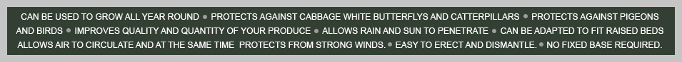 The walk-in wonderwall is a netted brassica/vegetable growing tunnel. It is a NO GO area for pigeons' / cabbage white butterfly and caterpillars, also, prevents slugs and snails from entering. Its design gives crops protection from strong winds, whilst allowing rain and sunlight to penetrate with ease Thus, making it an ideal growing environment for all vegetables, improving the quality and quantity of your produce.